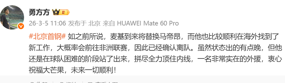 昨天麦基已经抵达北京了,他也会开启第二阶段的备战。当然麦基加盟之后,球队肯定要有人离开,最终马帝昂成为了牺牲品。根据曝光的消息来看,马帝昂已经找到了海外的工作,这样的速度也确实快。也没有办法,马帝昂应该早就知道自己要离队的消息了,特别是麦基确定加盟之后,他就要做好准备了。而马帝昂在第一阶段的最后阶段发挥其实是不差的,刚开赛的时候他只是一个蓝领球员,后续打着打...