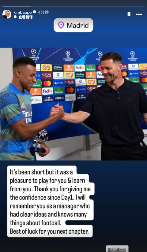 01月13日讯 皇马官宣阿隆索下课,姆巴佩在社媒发表动态与阿隆索告别。
